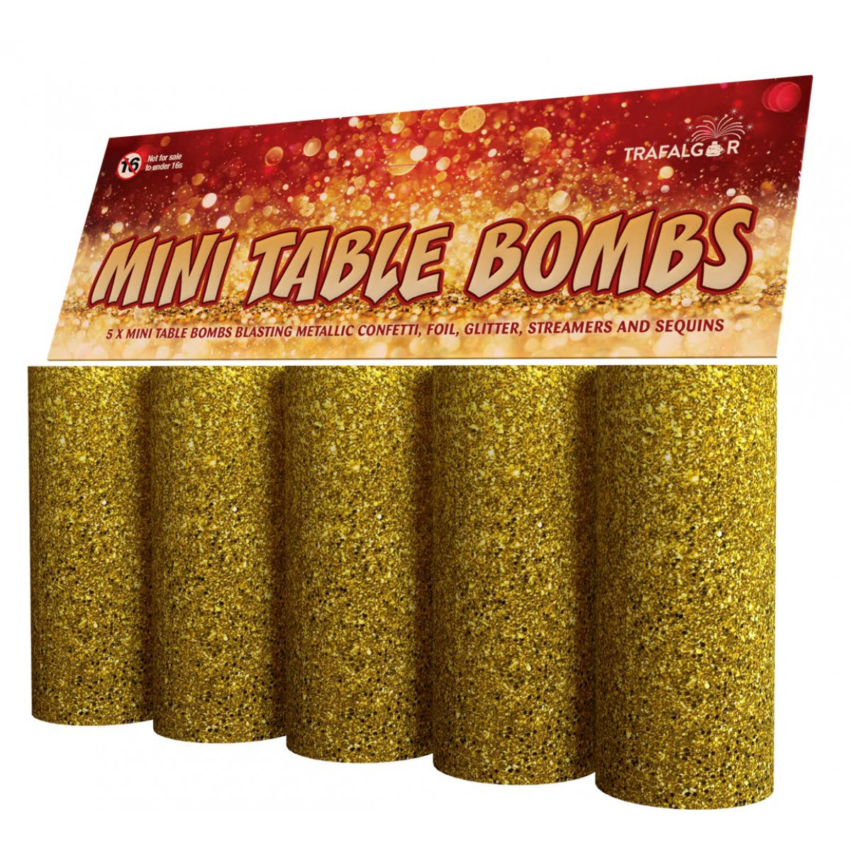 Pack of 5 Mini Table Bombs: Contents contain gold metallic confetti, foil, glitter, streamers and sequins. Ejection height between 1 and 1.5m.