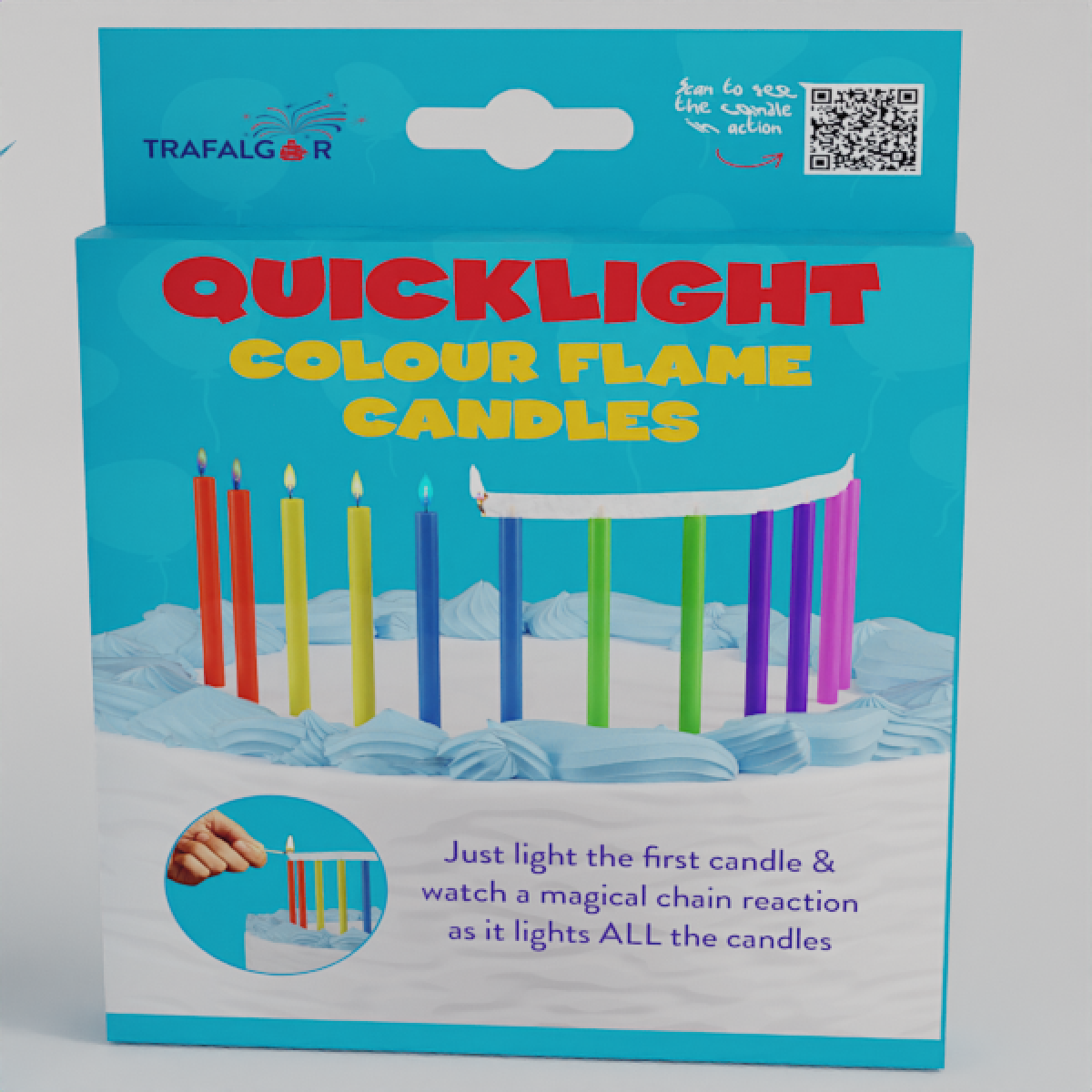 12 Birthday candles joined together with our secret formula connector. Light the first candle and watch them all ignite simutaniously - And what's more, each candles flame is the same colour as the wax candle.